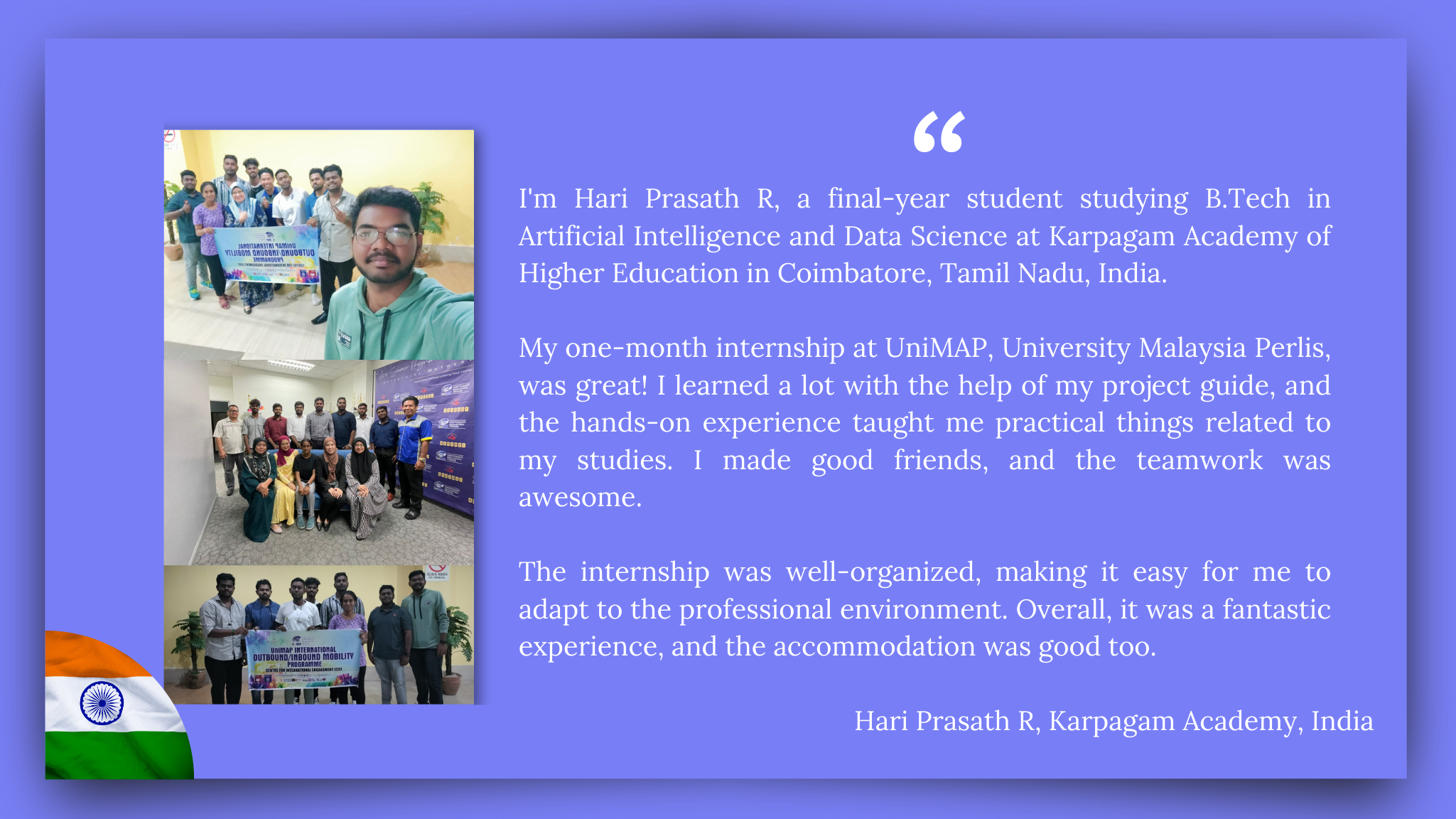 Inbound mobility programs offer a wide range of experiences especially here, in UniMAP, Perlis, Malaysia. Some programs may focus on language immersion, while others may offer specialized courses in a particular field of study. Regardless of that, students who participate in inbound mobility programs will undoubtedly gain a new perspective on the world and themselves.